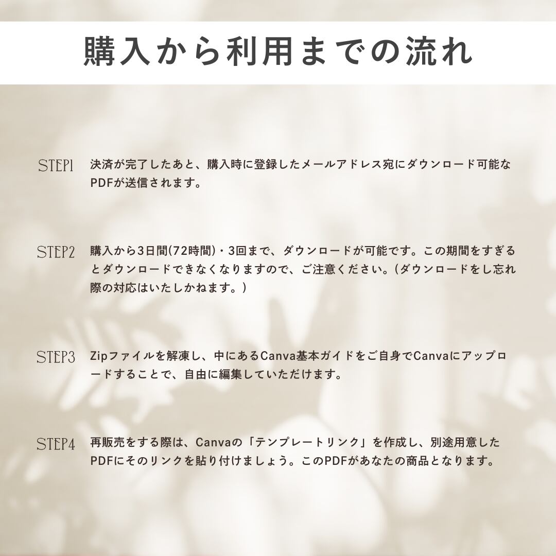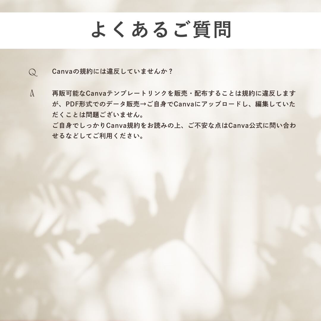 ・再販可能なCanvaテンプレートリンクを販売・配布することは規約に違反するため、PDFデータの販売となります。ご自身でCanvaにアップロードし、編集をしてください。